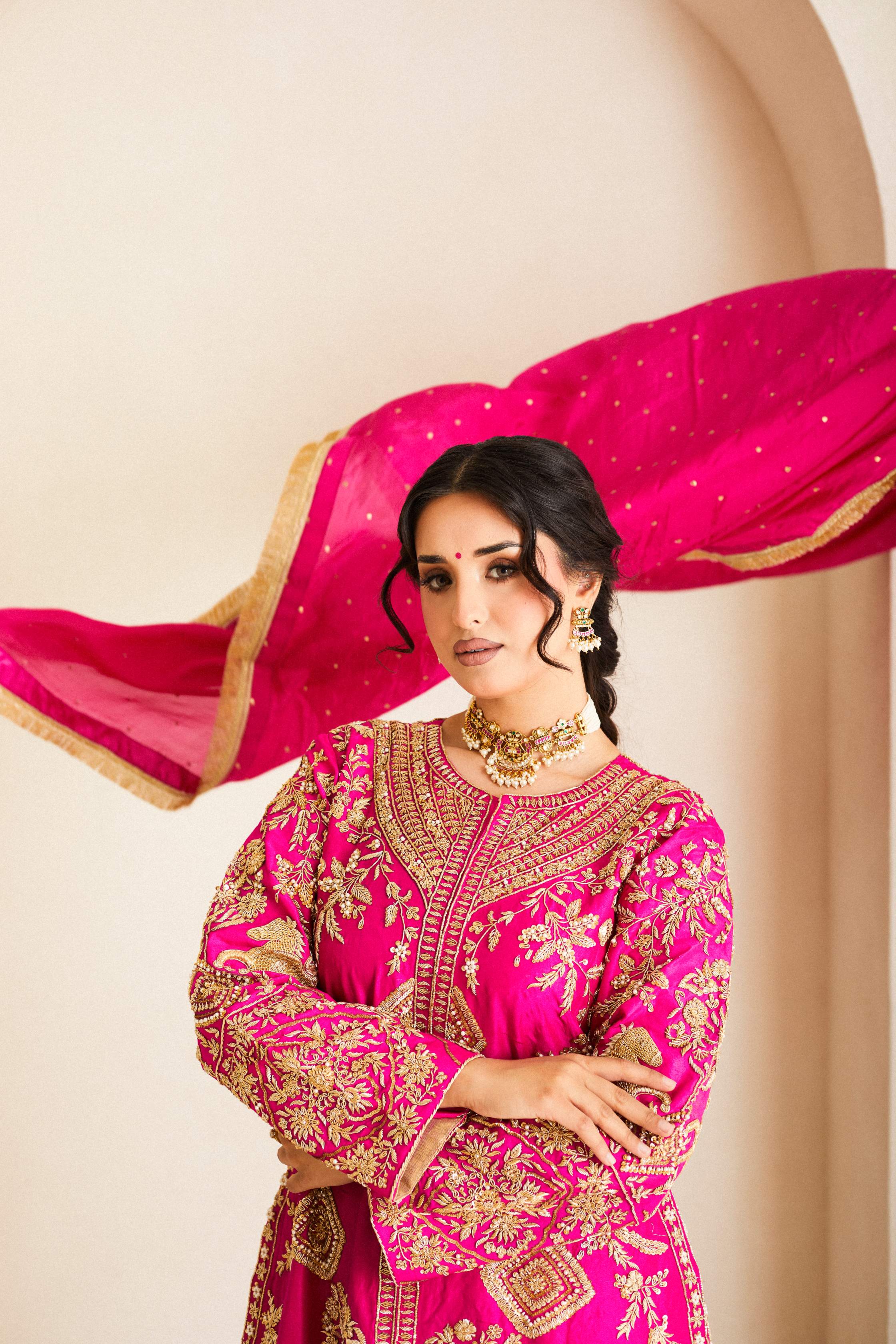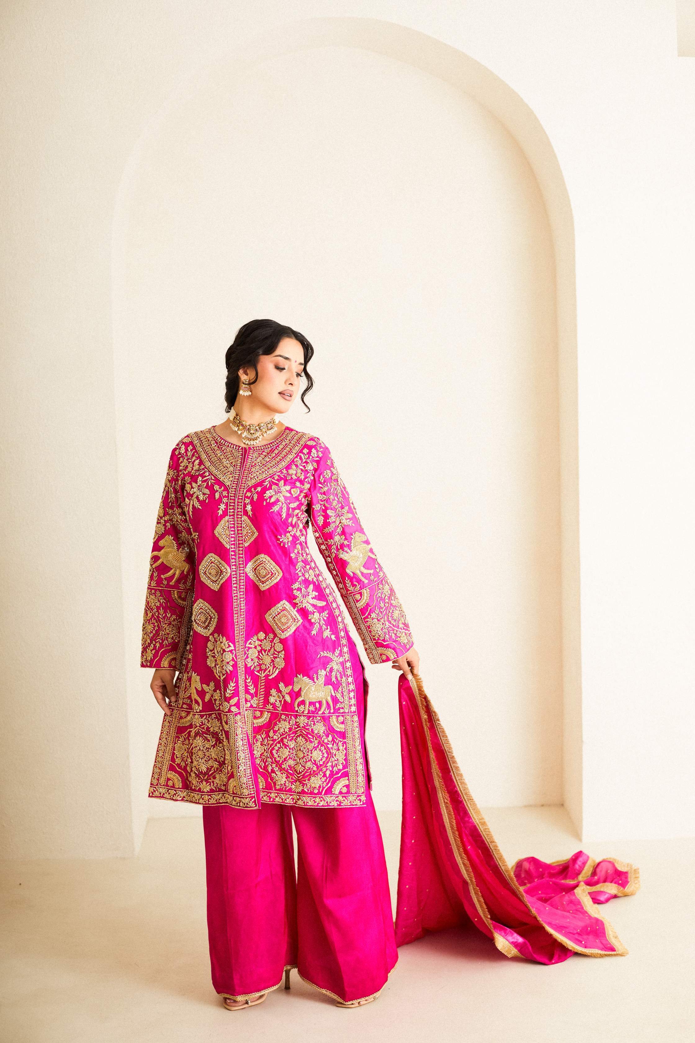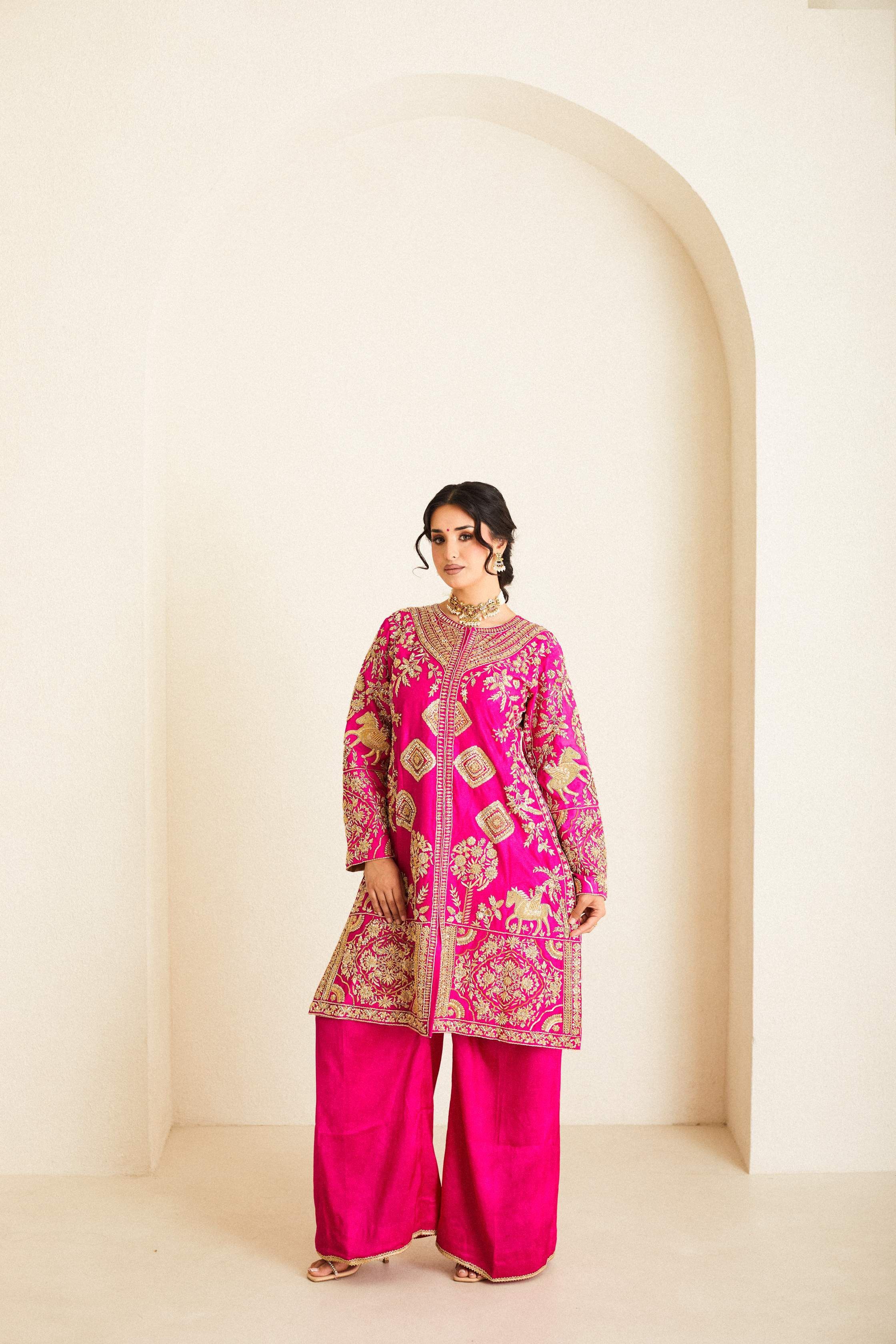 Make a bold statement in vivid hot pink (“Barbie” hue) with this striking modern take on traditional luxury. Crafted from pure raw silk, the shirt features heavy, intricate hand embellishments of kora, aari, dabka, pearls, and sequins on both front and back, creating a refined and regal aesthetic.
