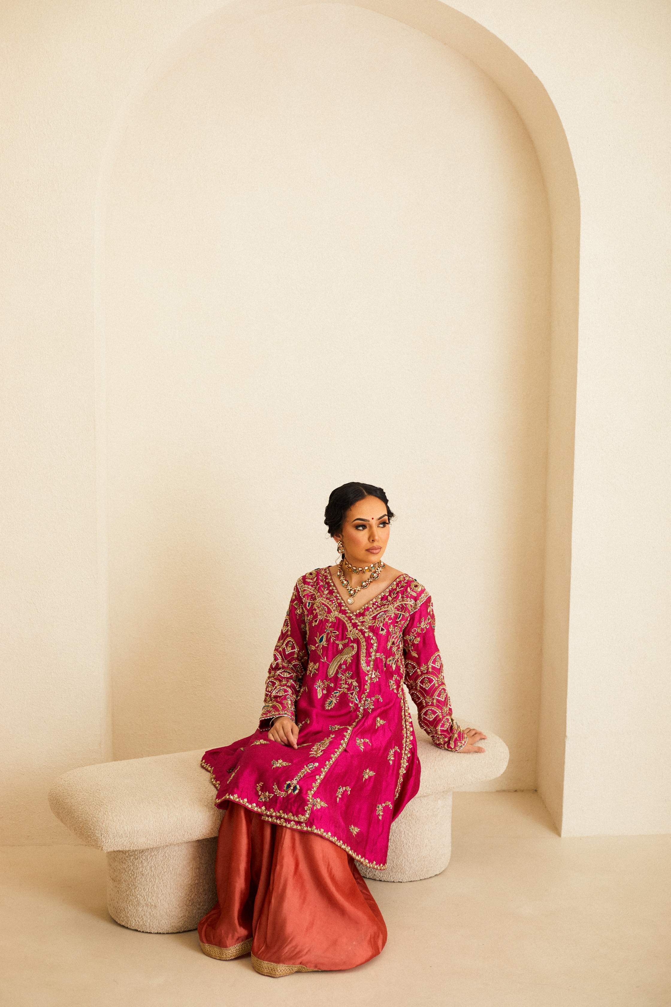 A vibrant hot pink angrakha featuring exquisite dabka and kora nakshi handwork that adds intricate texture and depth. Paired with wide dhaka rust orange and a luxurious medium silk dupatta finished with delicate kiran lace, this ensemble perfectly balances bold color with refined craftsmanship.