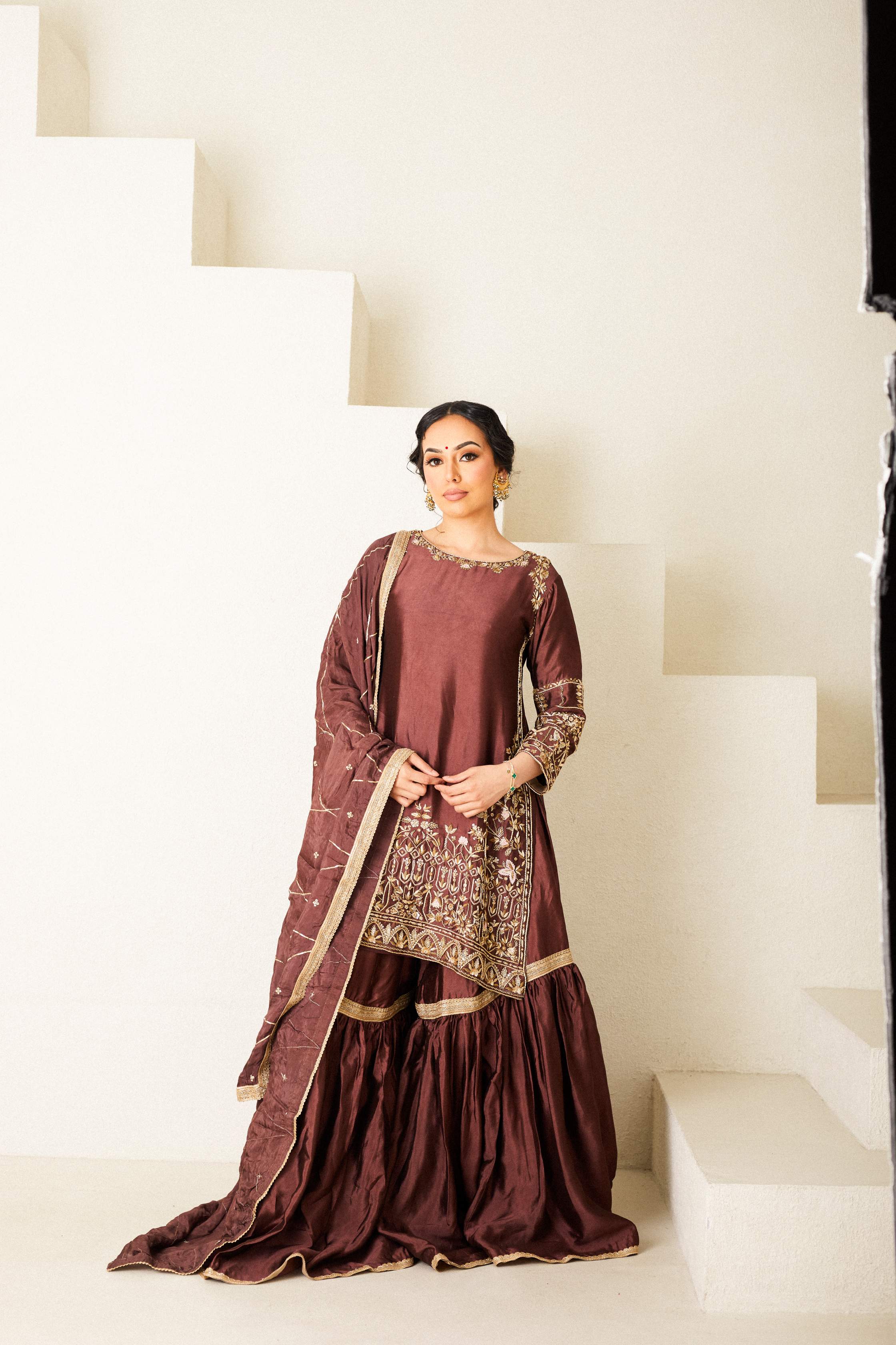 A timeless brown straight-cut pure sheesha silk ensemble, hand-embellished with dabka, pearls, and sequins on front and back. Paired with tailored farshi gharara, fully stitched and lined for a polished finish.